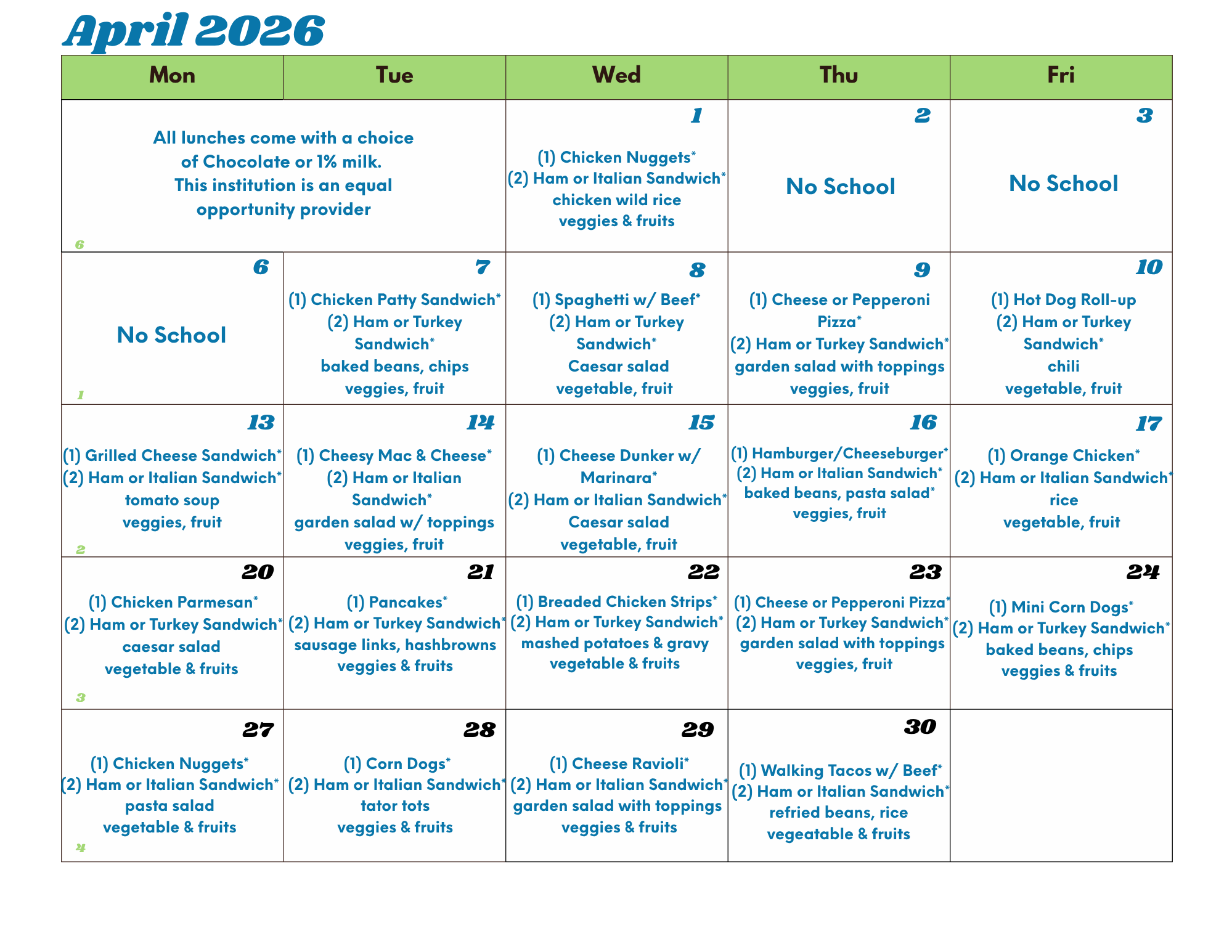 April Lunch Menu By Jess Herbst Wednesday, April 1, 2026 • 0 min read Posted in Hot Lunch April Lunch Menu